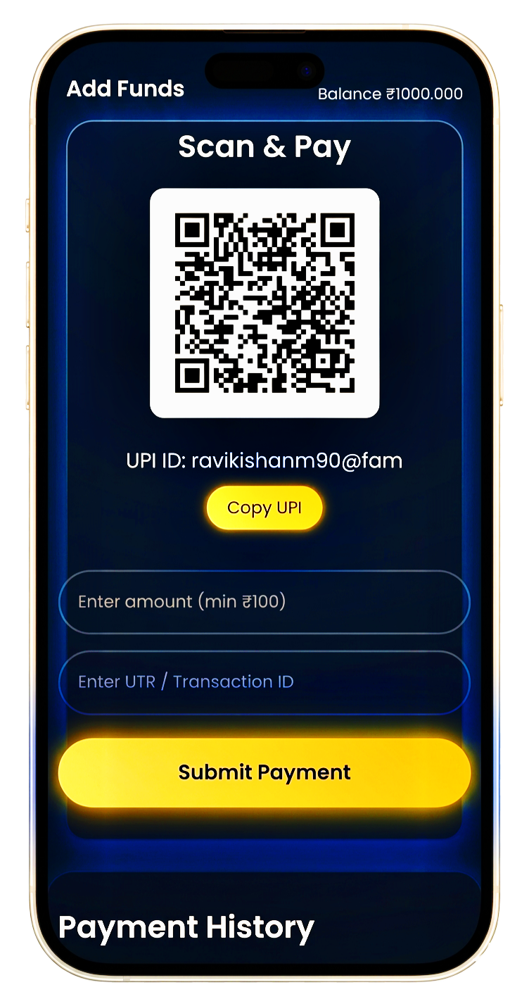 Wallet page open करें → QR code scan करें → UPI payment करें